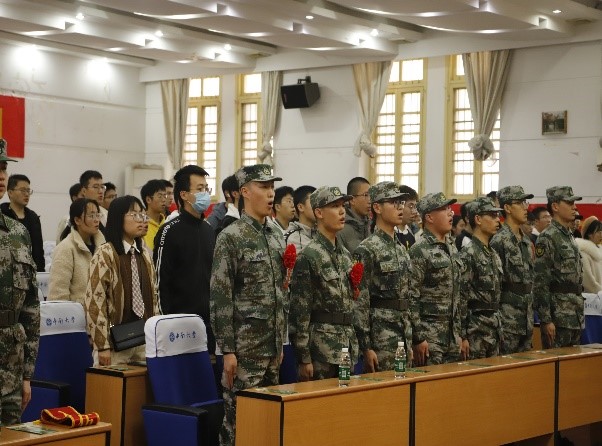 第二个大会紧接着开始,即征兵宣讲会。首先是由刘海澍老师对参军入伍进行政策性讲解,以及我们为什么要当兵的原因进行阐述。大会主要以6名优秀的退役大学生的经历为中心,展示了各个军种的特色与他们自身得到的荣誉。他们分别是火箭军的刘国欣、徐铭乾,陆军的胡铭欣、王秀华(女),海军的王艺瑾(女),武警的赵志强。其中胡铭欣曾是东部战区陆军电子对抗第一名,王秀华选拔为陆军特种部队秘密执行过香港维稳任务。一批一批优秀的中南人用实际诠释了大学生保家卫国的赤诚与衷心。