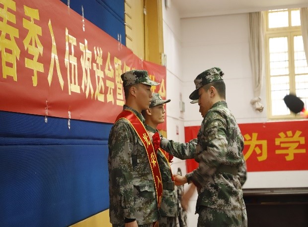 然后,2020退役士兵代表谢彪,文奇雄为两名新兵佩戴绶带和红花,希望他们能学习退役的优秀学长和学姐,带着中南人的拼搏和执着在军队继续发光发热。