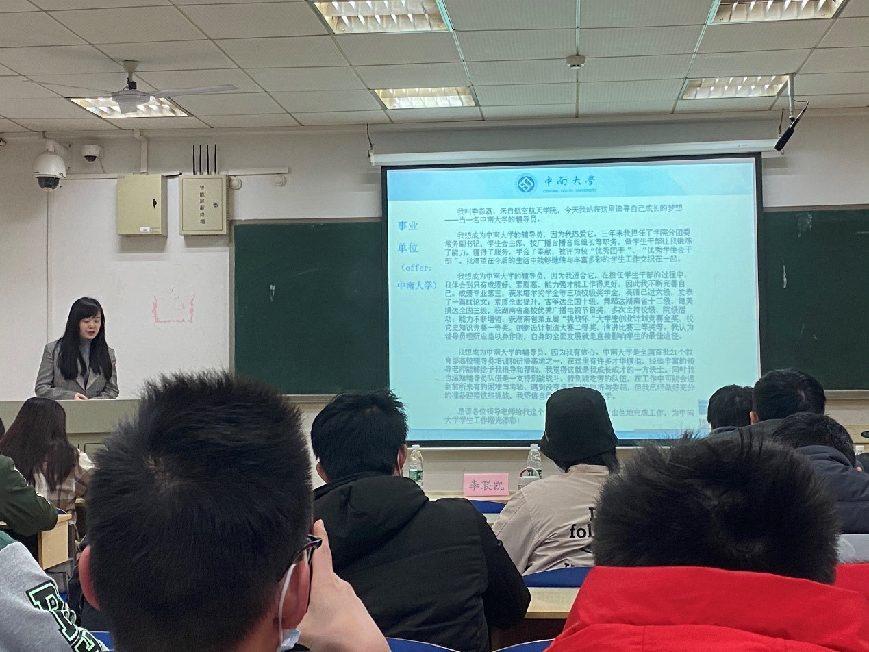 常秋碧辅导员主持。会议主要分为两个内容。首先是求职流程讲解,即由三位老师为学生们讲解简历优化、小组讨论以及表达沟通这三门课程。其次是优秀学生分享技术岗与非技术岗的求职面试小技巧。