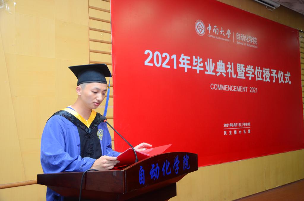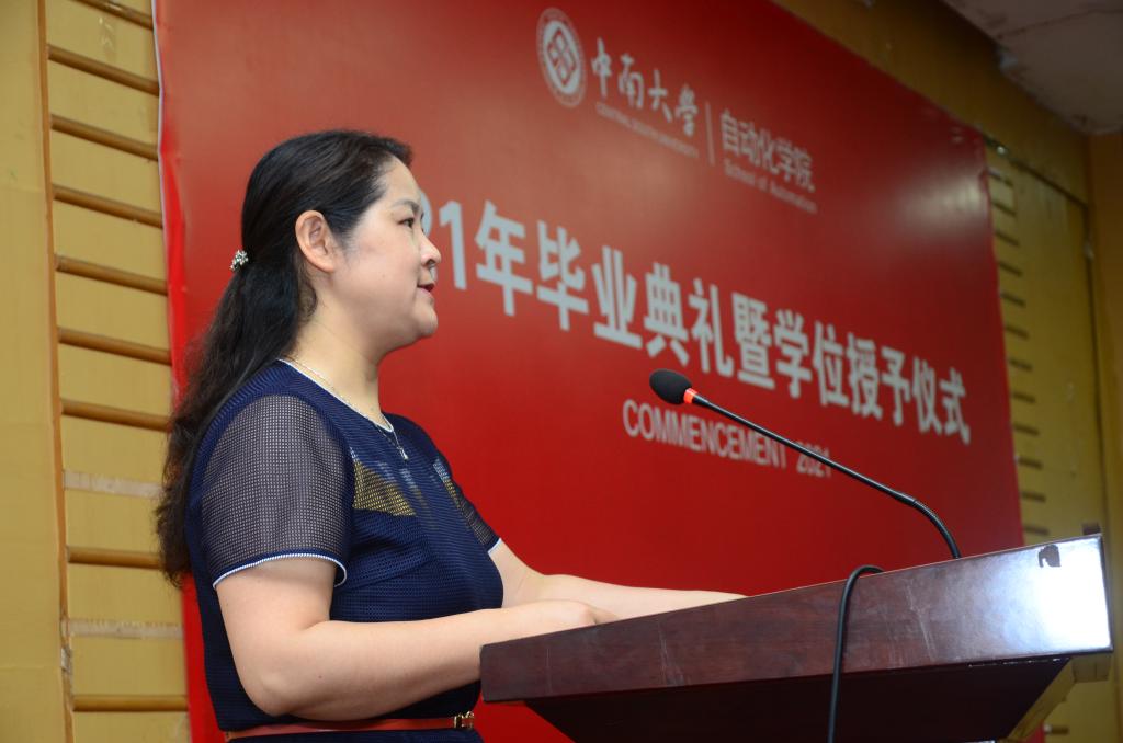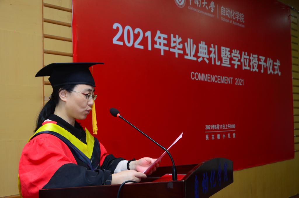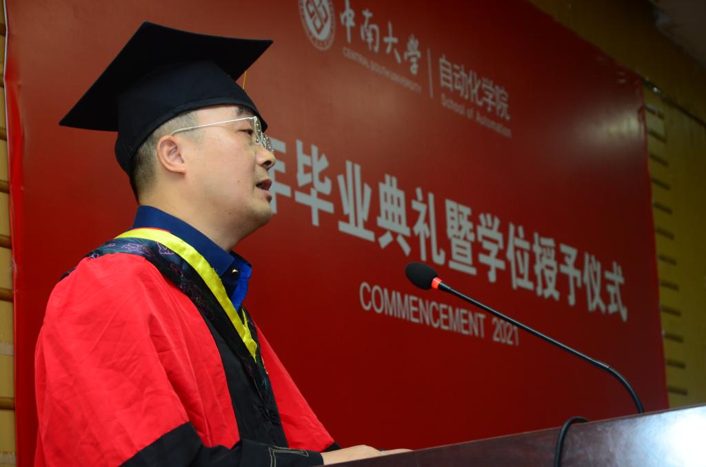 先后致辞。蒋朝辉教授回顾了自己在民主楼度过的求学时光和追梦之旅经历,希望学生们在今后的道路中秉承民主楼的文化精神去工作和生活。阳春华院长对毕业生们表达了真挚的祝贺同时也表示今年恰逢中国共产党建党100周年,在这个特殊的节点毕业,她希望学生们能深刻理解其背后的时代要求与使命,并提出了三点具体要求,第一是要求学生们要热爱伟大祖国,勇担时代责任。第二要牢记“知行合一,经世致用”校训,发扬中南品格。第三要增强学习紧迫感,保持终身学习的好习惯。