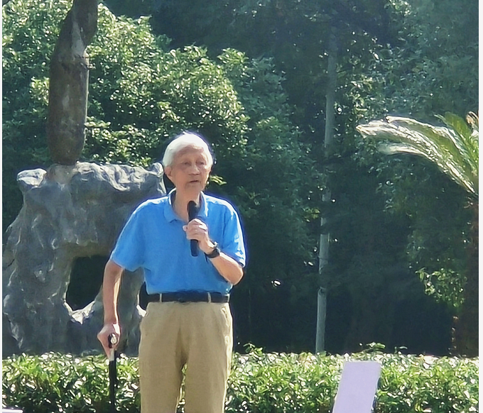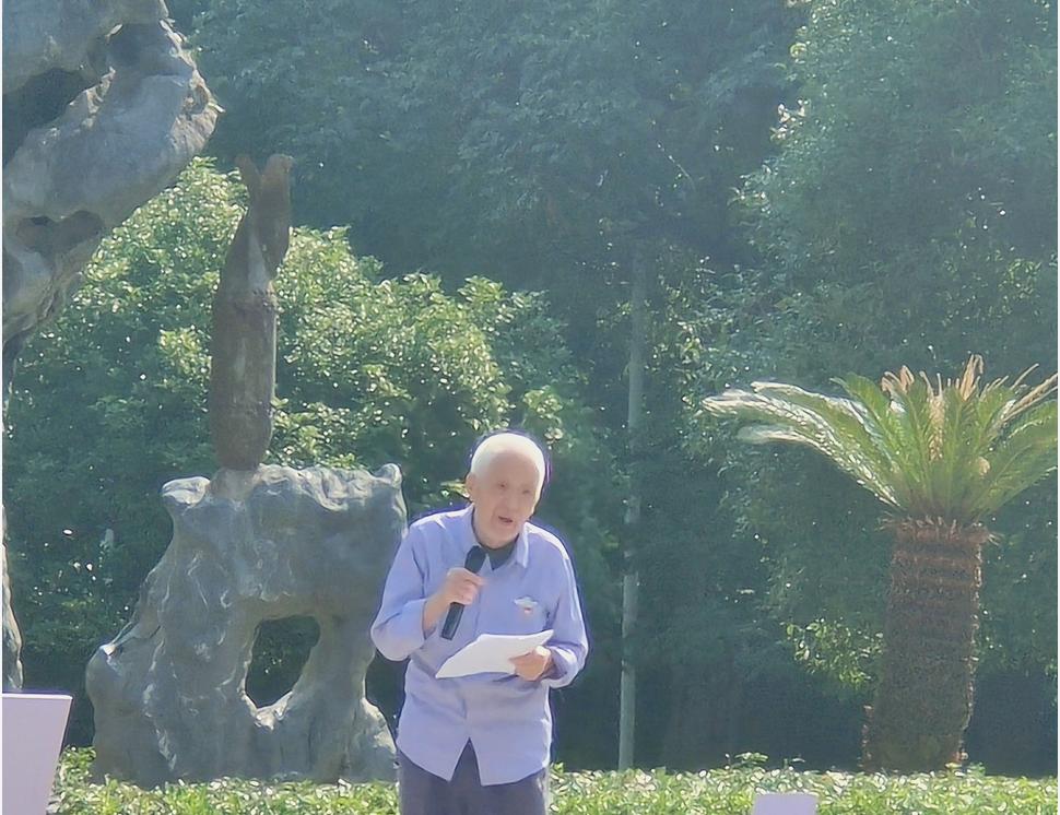 退休教授陈赫老师和原中南工业大学基建处副处长兼校绿化委员会专职副主任姚诤。他们引导学生们看向省园的雕塑,这个纪念雕塑由两块景石组成,一块寓意为“东方醒狮仰天怒吼”,一块则是经过安全处理的炸弹。他们凝视着那枚锈迹斑斑的炸弹,为学生们讲述起这枚炸弹背后的故事。1938年日军轰炸长沙,民主楼小礼堂也被炸毁了一角。1987年学校扩建教学楼时,姚诤老师在地基施工过程中挖出了当年日寇投下的三枚未爆炸弹,他激动地说:“这个就是日军侵华滔天罪行的铁证!”为了让全校师生铭记历史,这一枚经过安全处理的炸弹就被制作成纪念雕塑放在了省园内。它是日本军队轰炸长沙罪行的记录者,控诉着滔天的罪恶;亦是国家艰难岁月的守望者,引导着我们铭记历史! 听完两位老师的讲述,师生们纷纷眼含热泪。
