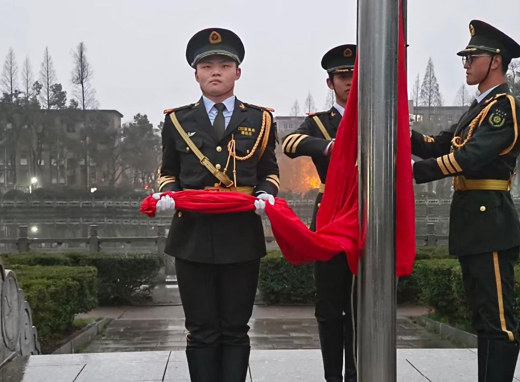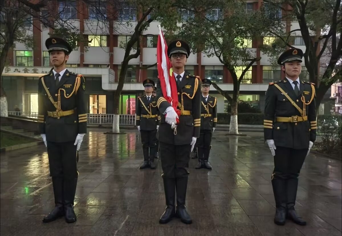 升旗仪式于6点40分准时开始,仪式在庄严的国歌声中拉开帷幕,五星红旗在晨曦中冉冉升起。擎旗手肩扛国旗走在队伍最前方,带领着整个护旗方阵,踏着矫健的步伐,以饱满的热情,庄严地护卫五星红旗进场。整齐的步伐,有力的摆臂,干净利落的转体,彰显着青春与朝气。在观礼师生响亮的国歌声中,撒旗手振臂一挥,将鲜艳的五星红旗扬至空中。当鲜艳的五星红旗在雨后新鲜的空气中冉冉升起,雄壮的国歌声飘荡在校园的上空时,毕业生们经受了一次心灵的洗礼,经历了一次具体而生动的爱国主义教育。