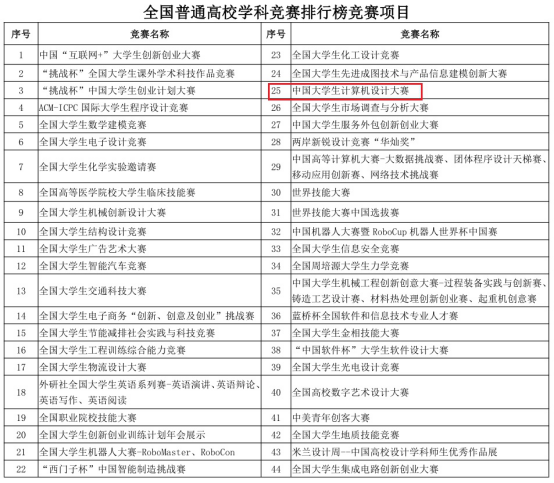 中国大学生计算机设计大赛是由教育部高等学校计算机类专业教学指导委员会、教育部高等学校软件工程专业教学指导委员会、教育部高等学校大学计算机课程教学指导委员会、中国教育电视台联合主办。中国大学生计算机设计大赛是教育部学科竞赛排行榜A类竞赛之一,也是我校重点支持赛事之一。