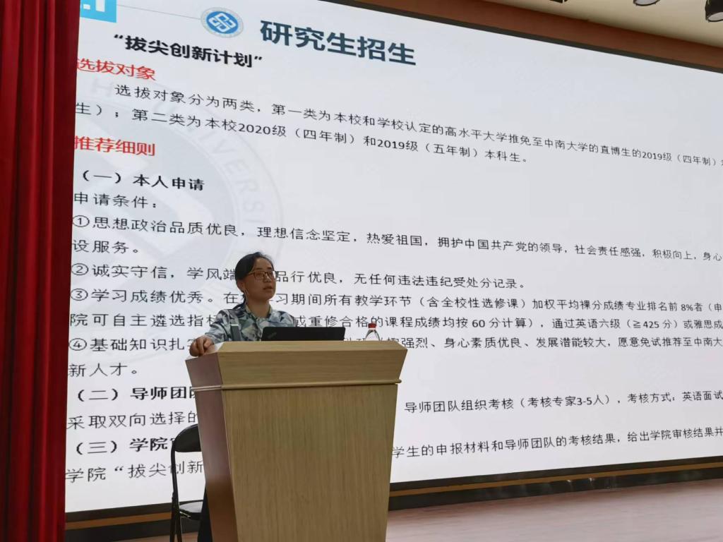 的发展历史、人才队伍、科研平台、特色领域等进行总体介绍;随后对本院研究生招生与培养的情况进行了详细说明,尤其对推荐免试研究生的申请事项、报名政策与优惠待遇等进行了重点强调;最后对研究生奖助体系及招生政策进行了细致解读。王院长的宣讲形式新颖、内容丰富、阐释精准,有很强的指导性和针对性,台下的同学们听得聚精会神,会上不时传来大家的掌声和欢笑。