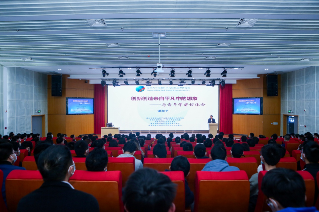 谢和平院士讲述了他自2018年3月进入深圳大学工作以来的科研创新之路。他介绍了自己“从零开始”探索新领域的内在动力,以及牵头组建的深圳大学深地科学与绿色能源研究院的研究领域、研究成果、团队建设情况、最新研究进展以及未来探索方向,着重讲解了他带领团队在深地深海深空原位保真取芯探矿原理和技术、CO2矿化发电颠覆性技术、仿生低耗能CO2电化学捕集技术、海水无淡化原位直接电解制氢技术、近零碳排放直接煤燃料电池技术等五大领域的研究思路和创新成效,向大家阐述创新创造如何在平凡中发现、在想象中思考。谈及深圳“再创业”的感悟,他鼓励在场师生,身处伟大新时代,要有信心、有底气、有担当,大胆探索、不懈奋斗,在大变革、大变局中谋进取、求发展。