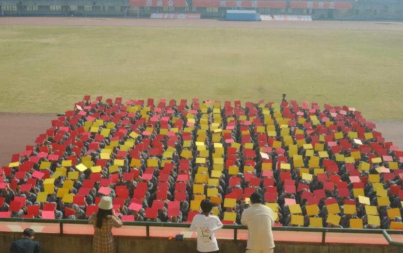 表演方阵今天在为排版图案而奋斗。根据以往的经验,每位同学被赋予了独一无二的编号,在指挥人员一声声的口令中,同学们一个一个地动起来,“1949”、“红船”的图案是一个点一个点堆砌而成的,如此的“作画”无论对指挥还是学生都是巨大的挑战。在一天的调整修正中,他们最终定型出最完美的图案!