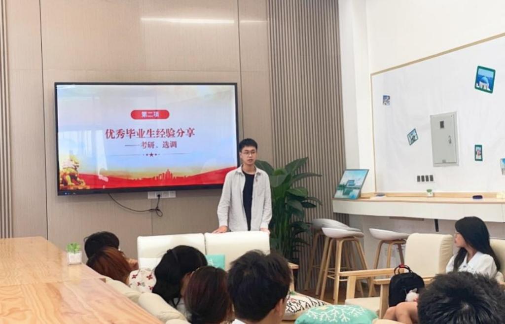 随后,毕业生党员代表与支部学弟学妹们分享经验。商如玉同志以“‘点击就送’——需要考研人做出哪些努力”为主题,从择校、学习安排、各学科学习方法、调剂等方面分享了自己考研至北京理工大学过程中总结的经验。芦俊杰同志通过叙述自己求职和考公的经历,帮助支部学弟学妹们了解“秋招”、“国考”、“省考”等流程,并提供了如何查询招聘信息、准备公务员考试等建议。此外,副书记陈泽鑫同志介绍了支部内各届毕业生党员去向,展示了支部的升学率和就业率,鼓励全体成员接续奋斗,不断进步。