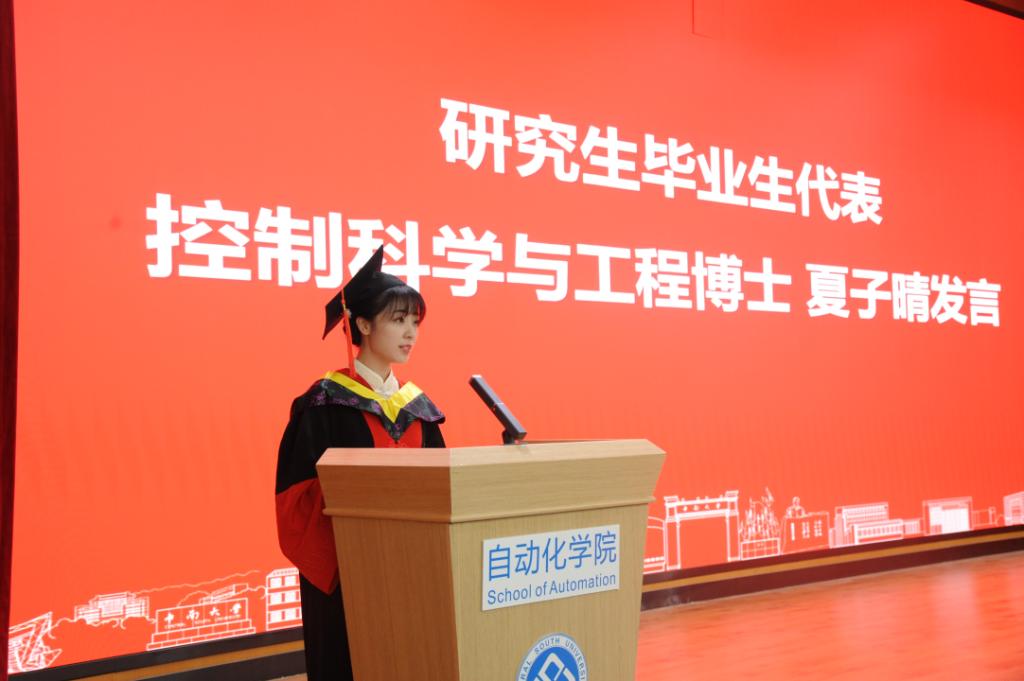 、不负祖国,谱写新时代的奋斗篇章。教师代表自动化系支部书记董密教授则寄语全体毕业生“青春可以毕业,但梦想不能毕业”“时光可以毕业,但情谊不能毕业”,她勉励毕业生们勇挑重担、堪当大任,在实现中华民族伟大复兴的征程中志道弘毅、砥砺前行。