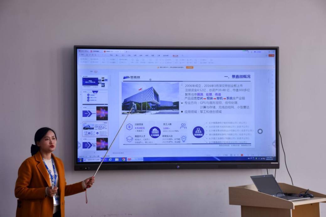 的优质人才培养机制,为企业输送了高水平专业人才。接着,她介绍了景嘉微电子股份有限公司概况与高潜人才招聘计划、各类岗位要求及政策福利。景嘉微各业务部门领导也对部门概况、业务领域及岗位需求进行详细介绍,加强同学们对企业的了解。