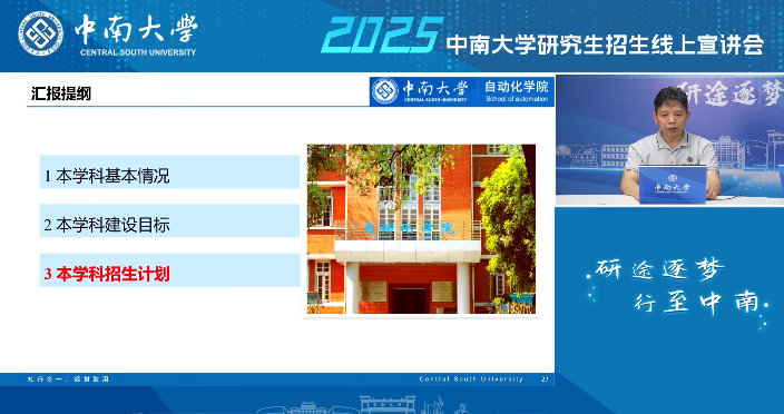 自动化科学与技术系主任蒋朝辉教授、电气工程系主任孙尧教授、人工智能系书记赵于前教授携其精心准备的招生宣传文案,向大家详细介绍了各个学科的研究方向、特色及优势、人才师资力量、科研实力等内容。