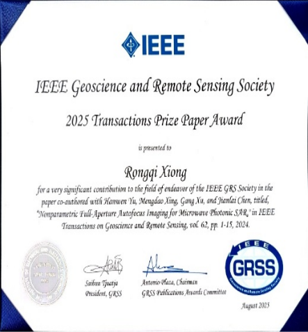 近日,国际遥感领域最大规模会议 IEEE IGARSS 在澳大利亚布里斯班举行。九游会陈溅来副教授及博士生熊蓉琪等发表的IEEE会刊论文《Nonparametric Full-Aperture Autofocus Imaging for Microwave Photonic SAR》,获 2025 IEEE GRSS TGRS Prize Paper Award(全球每年仅 1 项)。