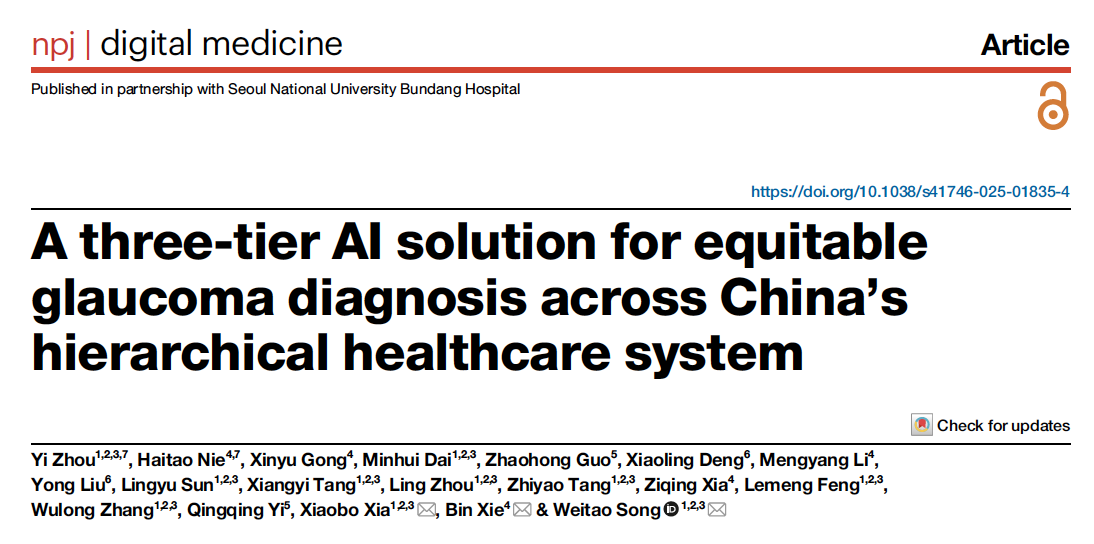湘雅医院夏晓波、宋伟涛教授团队在国际权威期刊《npj Digital Medicine》发表题为 “A three-tier AI solution for equitable glaucoma diagnosis across China’s hierarchical healthcare system(服务于中国分级诊疗体系的三层级人工智能系统:实现青光眼诊断的同质化)”的研究论文。九游会