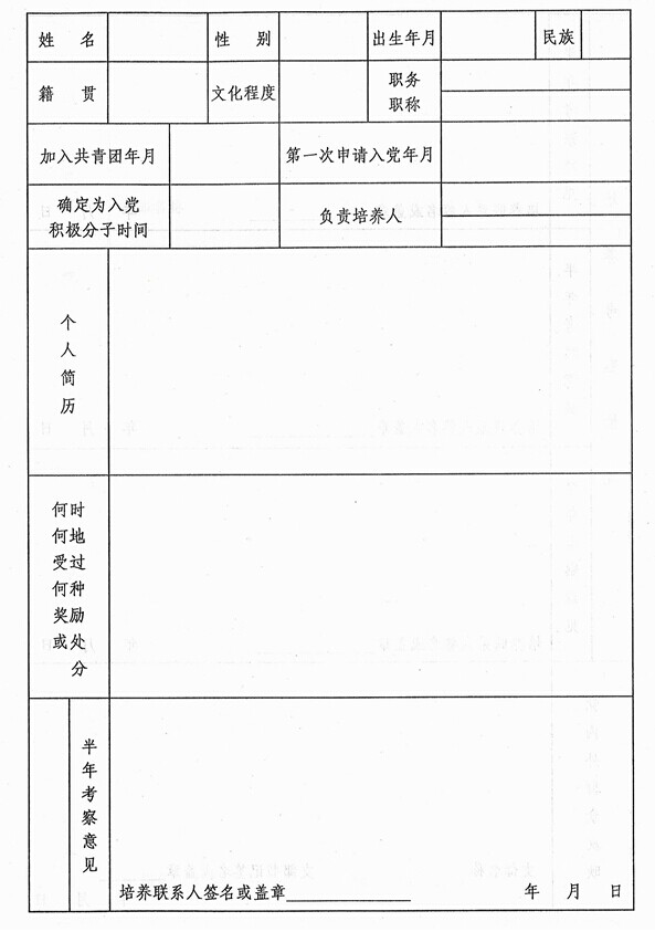 注意:该栏目应从确定为积极分子时开始填写,栏目不够的可附页(超过两年)。