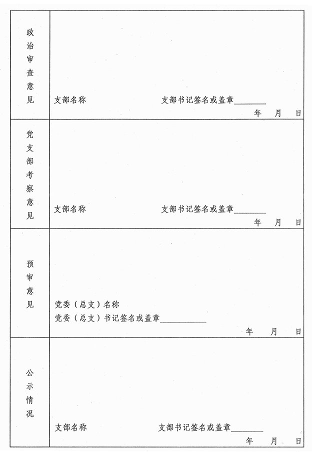 ⑧“公示情况”应填写发展对象经支部大会讨论通过后,报二级党组织审批前,在新发展党员对象的单位或居住地进行公示的时间、内容、群众反映,以及依据群众反映情况作出的处理。