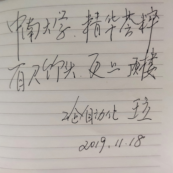 “现在社会变好了,每个人都可以自由选择职业,职业选择的方向也多了,不像我们当年要服从国家分配。现在国家也非常强大了,每个人吃饱穿暖基本都可以实现。现在有了互联网,每个人都可以在网络上很容易地查到自己所需要的信息。中南学子一定要充分把握目前的机会,你们是赶上了信息化的大潮,赶上了国家高速发展的大潮。‘是金子总会发光’这句话在现在的社会上越来越容易实现了。”但王立也告诫中南学子不要学习网络上那些网红,不要把个人目前仅有的一点才能都展示出来,不要去渴望一种快餐式的挣钱方式,这种方式没有可持续性,总会有才能枯竭的一天。中南人要有自己的内涵,要给自己画一个蓝图,要为一个目标去奋斗;要多经历一些事情,不论经历事情是好是坏,但不是做违法乱纪的事,经历的事情多了就会增加自己的阅历,这对未来的发展是有帮助的;要学好英语,多与国外做国际交往,不是说国外的月亮更圆,而是可以让我们开拓视野,这样才会培养出自己的想法,知道自己到底想要什么,才会主动出击做自己想做的事。