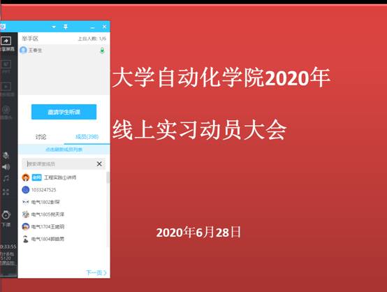 2020年6月28日下午3点,电气工程及其自动化专业17级、18级共400多学生举行了云端实习动员大会。九游会 王春生副院长、电气工程系李志勇书记、于晶荣副主任及全体实习带队老师和同学参加了会议。